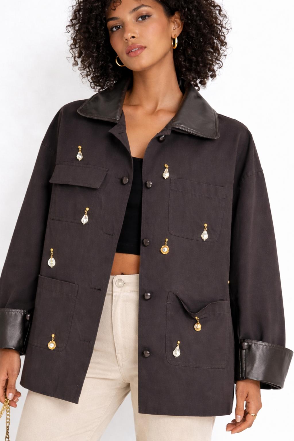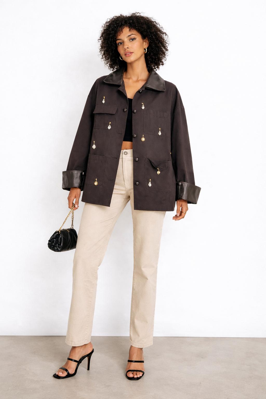 Ένα κομμάτι που απογειώνει κάθε σύνολο. To oversized μπουφάν με τις ιδιαίτερες χρυσές διακοσμητικές λεπτομέρειες προσθέτει πολυτέλειασ και χαρακτήρα σε κάθε εμφάνιση .Φοριέται απο το πρωί έως το βράδυ και συνδυάζεται εύκολα τόσο με casual looks όσο και με πιο elevated σύνολα .