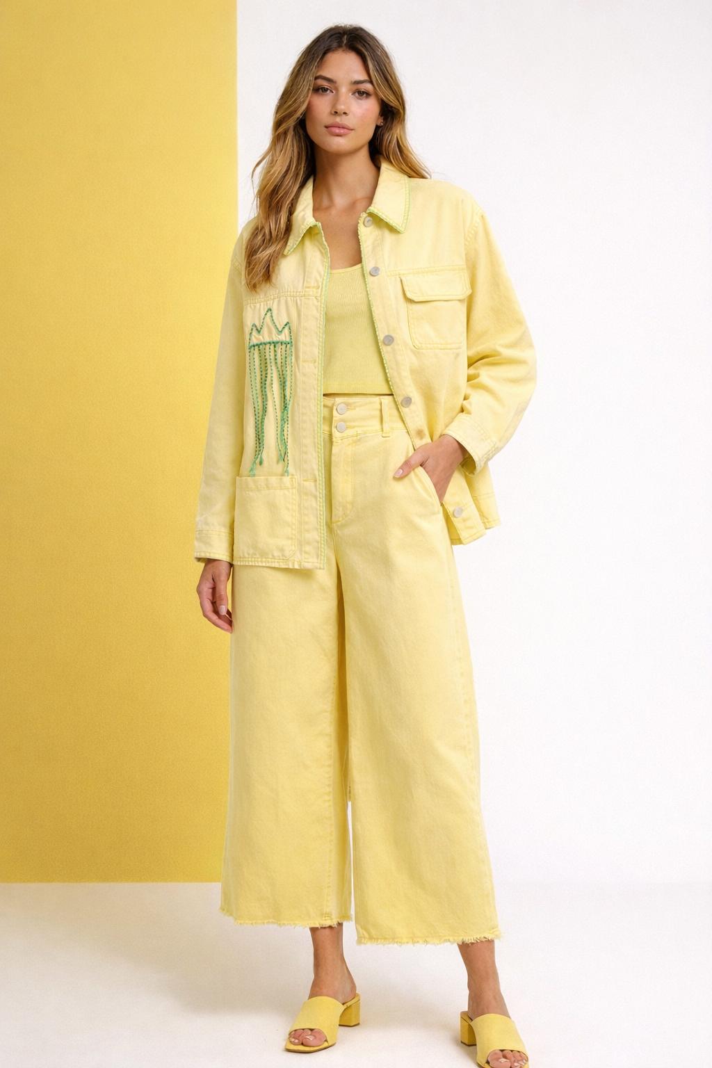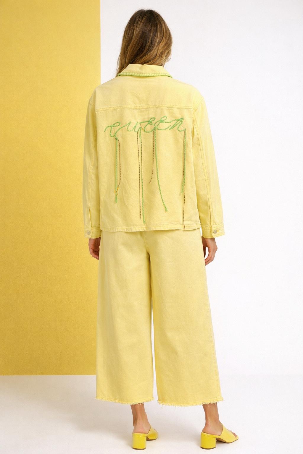 Το απόλυτο Τζάκετ της σεζόν σε απαλή παστέλ κίτρινη απόχρωση .Το ιδιαίτερο αυτό τζάκετ ξεχωρίζει χάρη στο μοναδικό κέντημα Queen στην πλάτη με διακοσμητικά κορδόνια που προσθέτουν μια ξεχωριστή fashion πινελιά. Διαθέτει άνετη γραμμή ,πρακτικές τσέπες και διακριτικές πράσινες ραφές που δημιουργούν όμορφη αντίθεση με το χρώμα του υφάσματος. Φοριέται εύκολα απο το πρωί έως το βράδυ και συνδυάζεται ιδανικά με το αντίστοιχο παντελόνι για ένα ολοκληρωμένο ,μοντέρνο outfit,